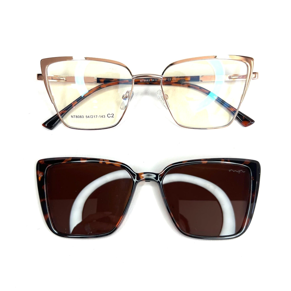 Estilo e funcionalidade em perfeita harmonia. Este modelo clip-on traz uma armação de grau sofisticada em metal rosé com hastes tartaruga, combinada a um poderoso clip solar magnético em acetato tartaruga com lentes marrons. O formato quadrado com cantos levemente angulados adiciona um toque moderno e marcante ao visual. Um verdadeiro 2 em 1 para quem quer praticidade com muito charme — da luz do escritório ao sol do fim de tarde.
